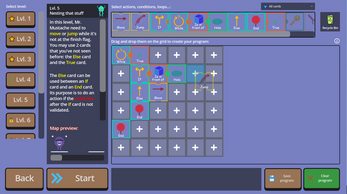 Blokoding makes it easier for children to learn programming. Yeah, a game to learn programming! Just drag and drop cards (for instance actions, loops, conditions...) and start a level to make your character move and execute your program in-game.